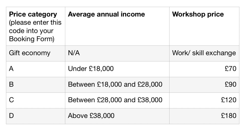 WORKSHOP FEE: This is a 2-day workshop with a tiered fee based on annual income. Please add the appropriate Price Category code to the BOOKING FORM from the table below.