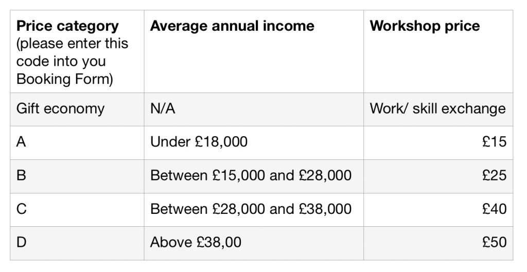 WORKSHOP FEE per workshop: This is a 1-day online workshop with a tiered fee based on annual income. Please add the appropriate Price Category code to the BOOKING FORM from the table below.