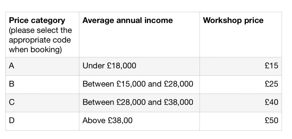 WORKSHOP FEE per workshop: This is a 1-day online workshop and has a tiered price structure (CATEGORY A-D) with an aim to be both affordable and appropriately priced for participantsโ financial circumstances.