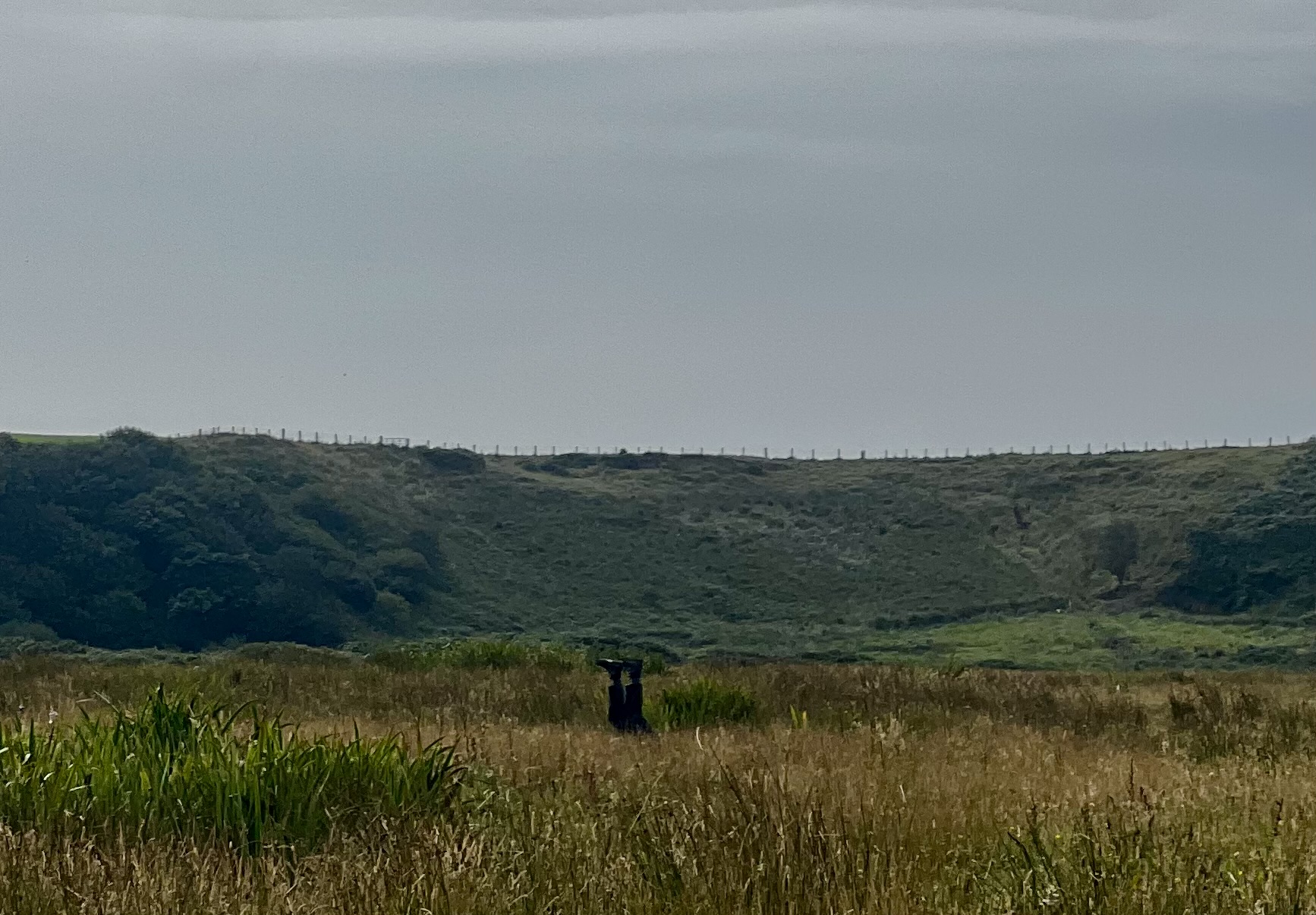 main image description: a colour photograph depicting a wild golden meadow with green hills behind, a pair of booted human feet appear from the long summer grass, stretching up towards the soft blue sky above.