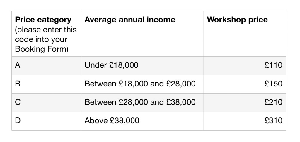WORKSHOP FEE: This is a 2-day workshop with a tiered fee based on average annual income. Please use the appropriate Price Category code from the table below when booking. Please carefully consider which Category applies to you – and also consider, if tyou share resources in your household, whether the Category you choose reflects the average income of the income-earning members of your household.