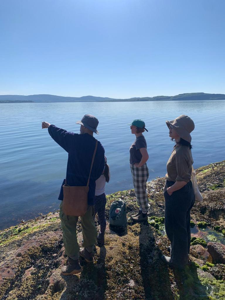 image description: 2 colour images – Tom collecting wild garlic / participants looking out over the Firth of Clyde