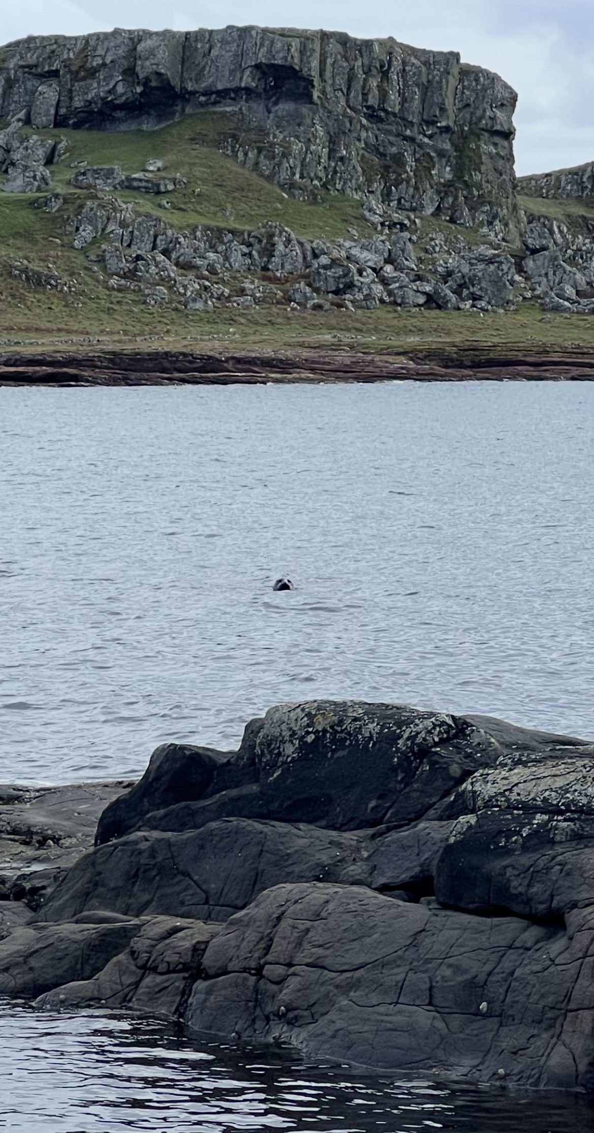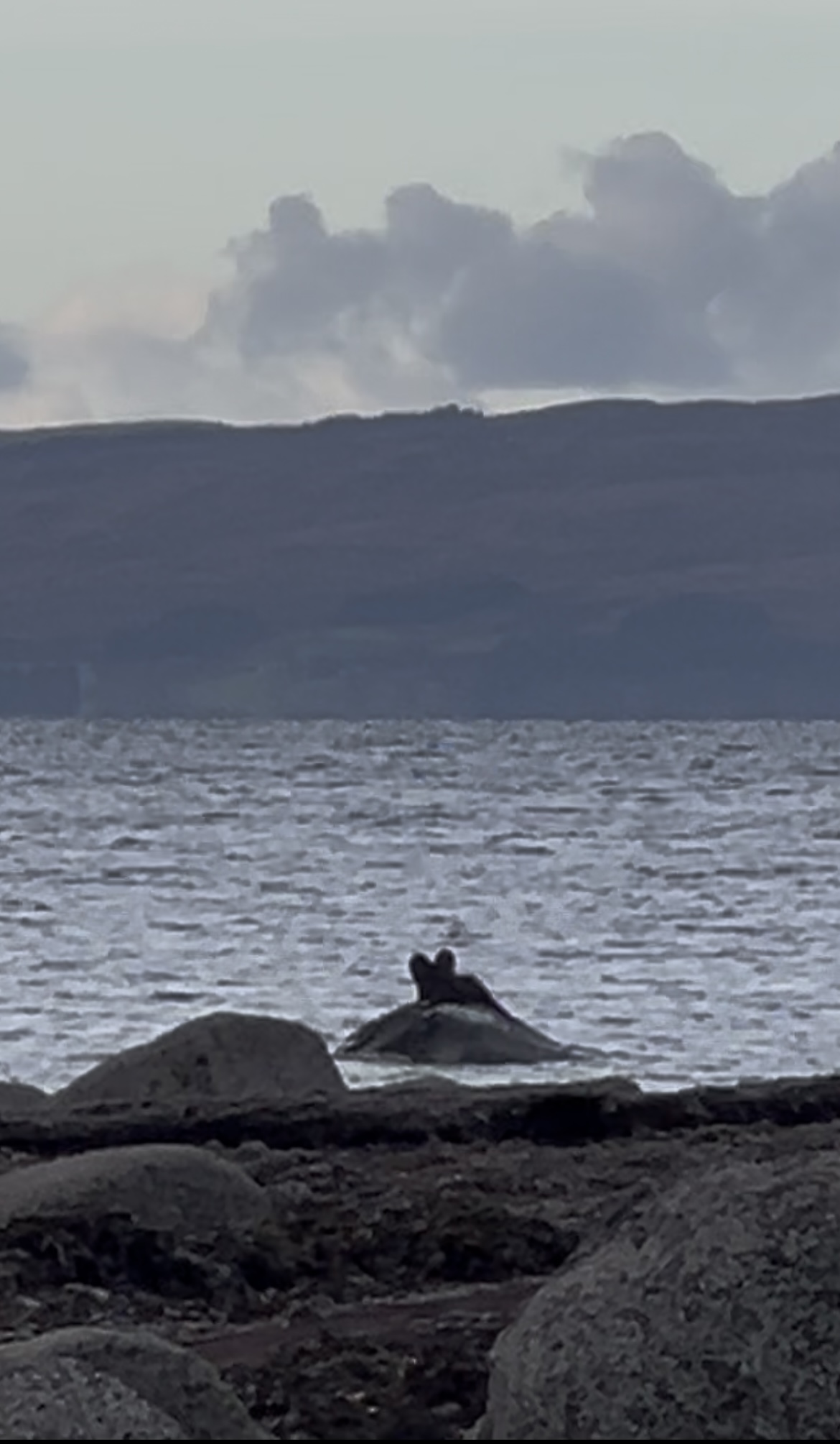 image description: 2 colour long distance photos – a surfacing seal in a rocky bay, 2 silhouetted otters on a small rock in coastal waters