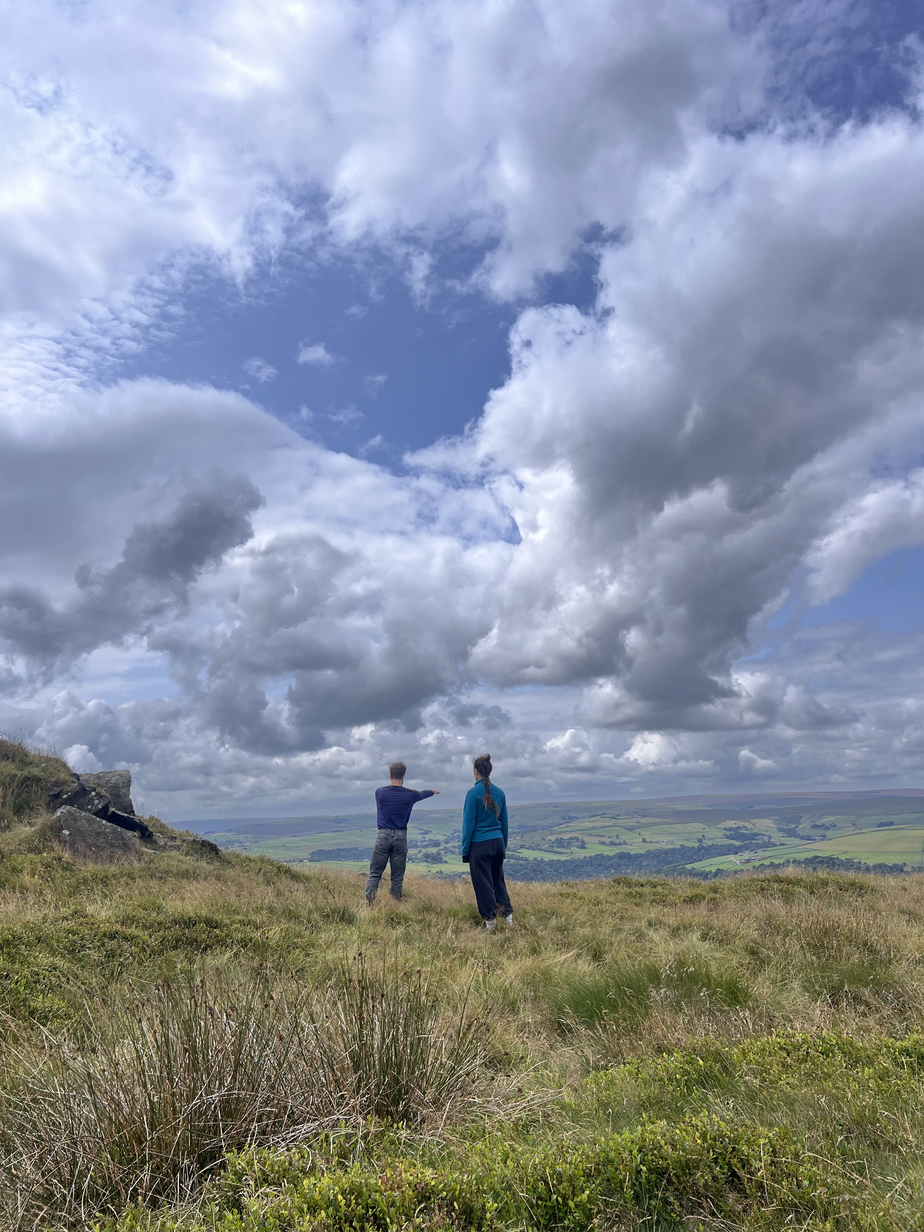 main image description: a colour photograph – under grey/blue skies sits a circle of outdoor-clothed humans on a hill of long grass in front of a Summer forest valley. The group look intently towards the camera.