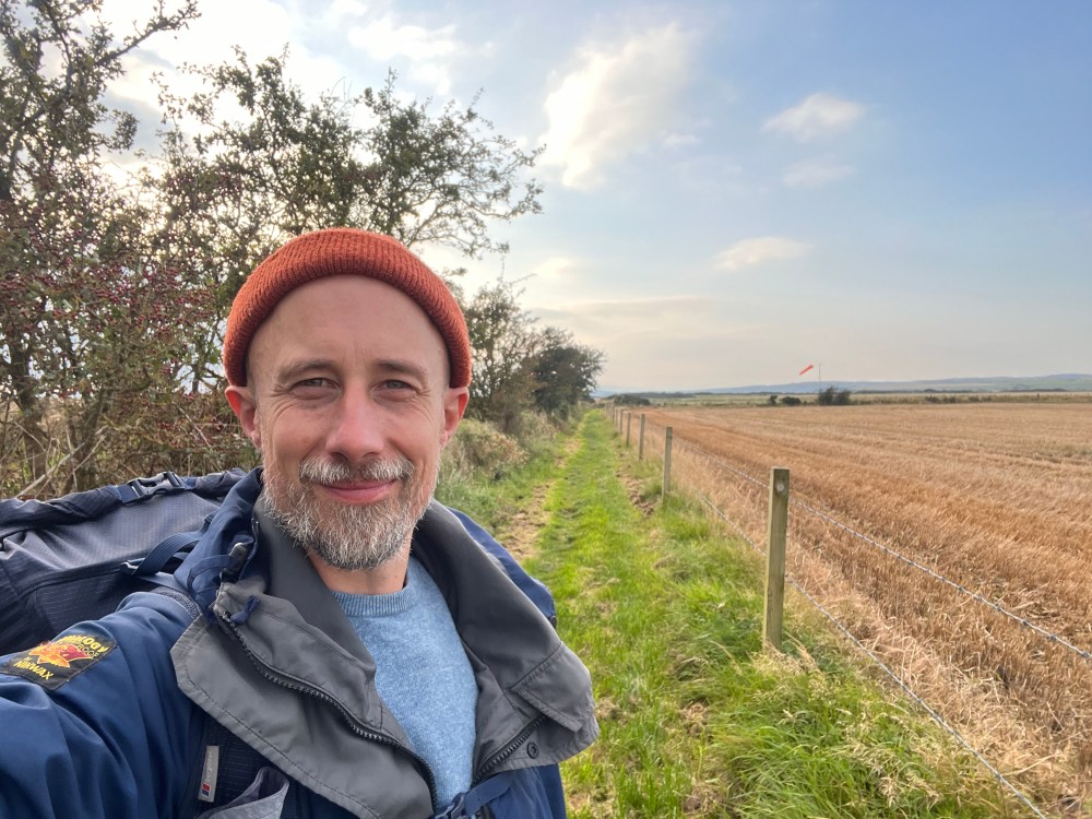 facilitator colour photo description: Tom (a pale-skinned man with salt and pepper beard and orange hat) looks to camera with a long straight path running off to the distance, hawthorn trees to one side and cut field to the other